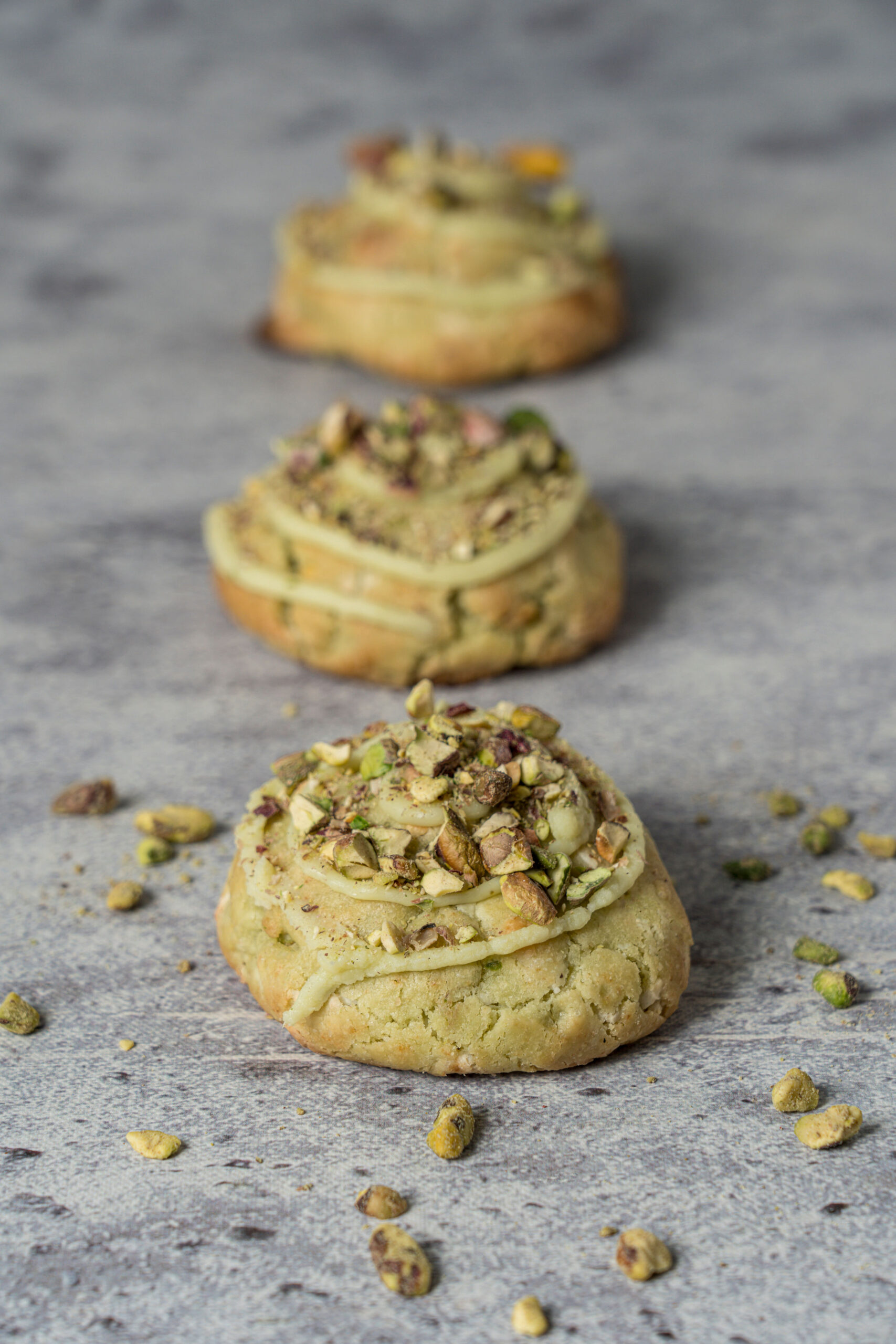 Cookie de pistacchio, con frambuesas, chocolate blanco y pistacchio tostado.