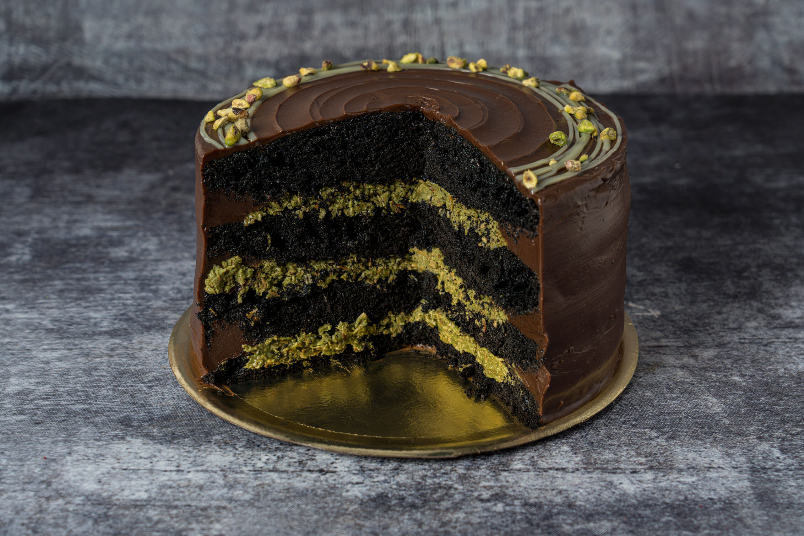 Bizcochuelo de chocolate black. rellena con mezcla dubai y cobertura de ganache de Chocolate semiamargo y pistachos.