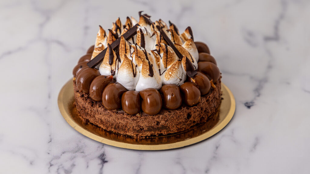 Base brownie de chocolate y nueces, dulce de leche y merengue italiano.