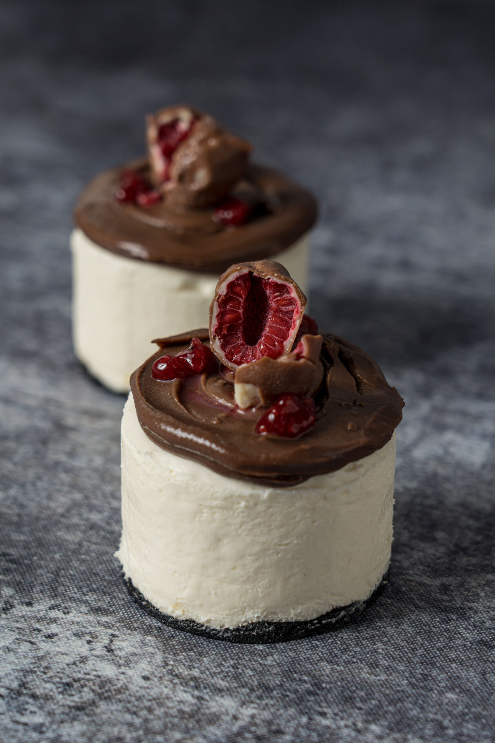Crocante de chocolate blanco con corazón de frambuesa y ganache de chocolate con franui.